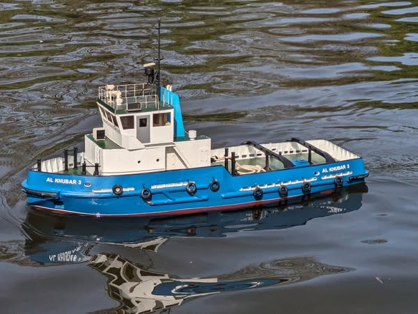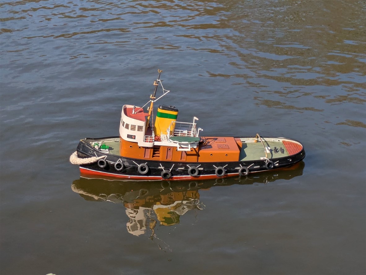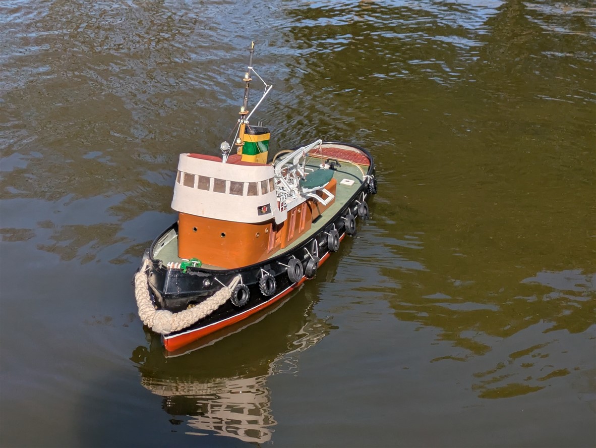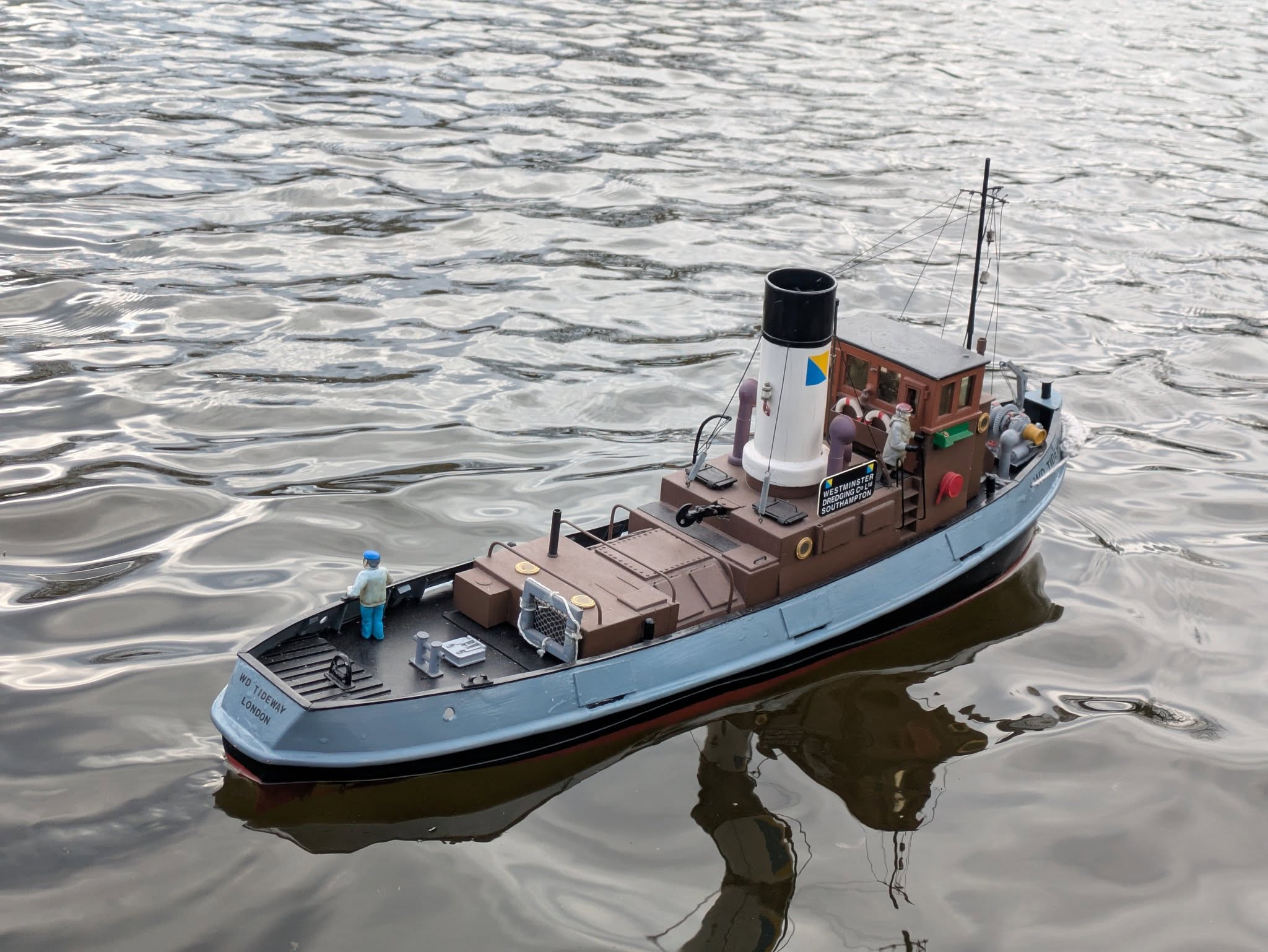 The real boat has a history that takes it all over the world. Built in Japan in the 1970s as a tug, it was used as a tug in Saudi Arabia and much more recently worked as a dredger in Cardiff. There were three made in this design, and its owner chose to model the biggest one.