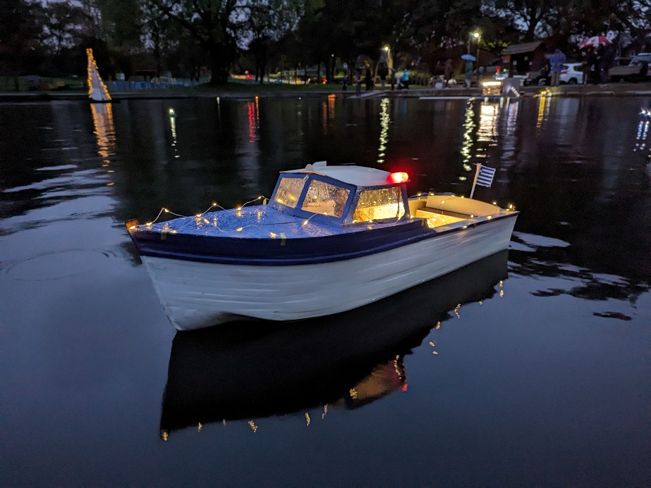 It is decorated with a Greek flag flown from the stern, and the name across the transom. Inside there are benches and life rings at the back and a simple driving position under the canopy. There are lights in the boat which illuminate the inside and display red/green navigation lights from the canopy, all of which can be turned on and off remotely.