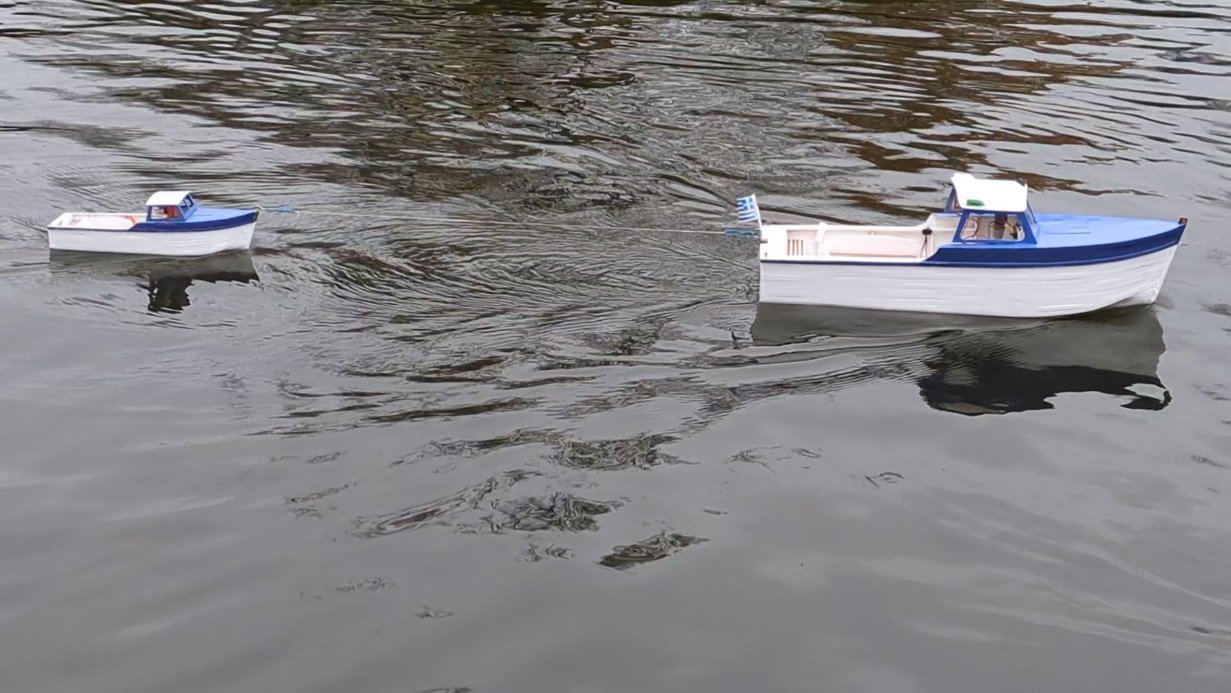 After completing this one, I made another version half the size. The smaller one is not motorised, but towed from the flagpole of the larger one. Keeping the Greek theme, the smaller one is named ‘Nεοσσος’ (Nessos, translation: fledgling. I like the look of the two together like a duck and a duckling.